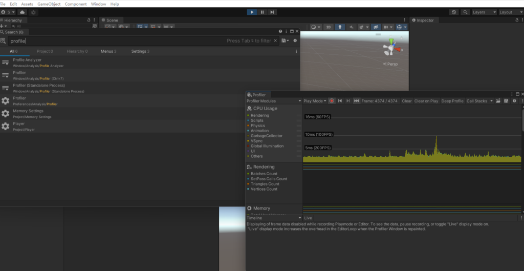 - 单击"Profiler"按钮,它将打开一个新的分析器窗口,其中包含游戏窗口的统计信息和性能数据。